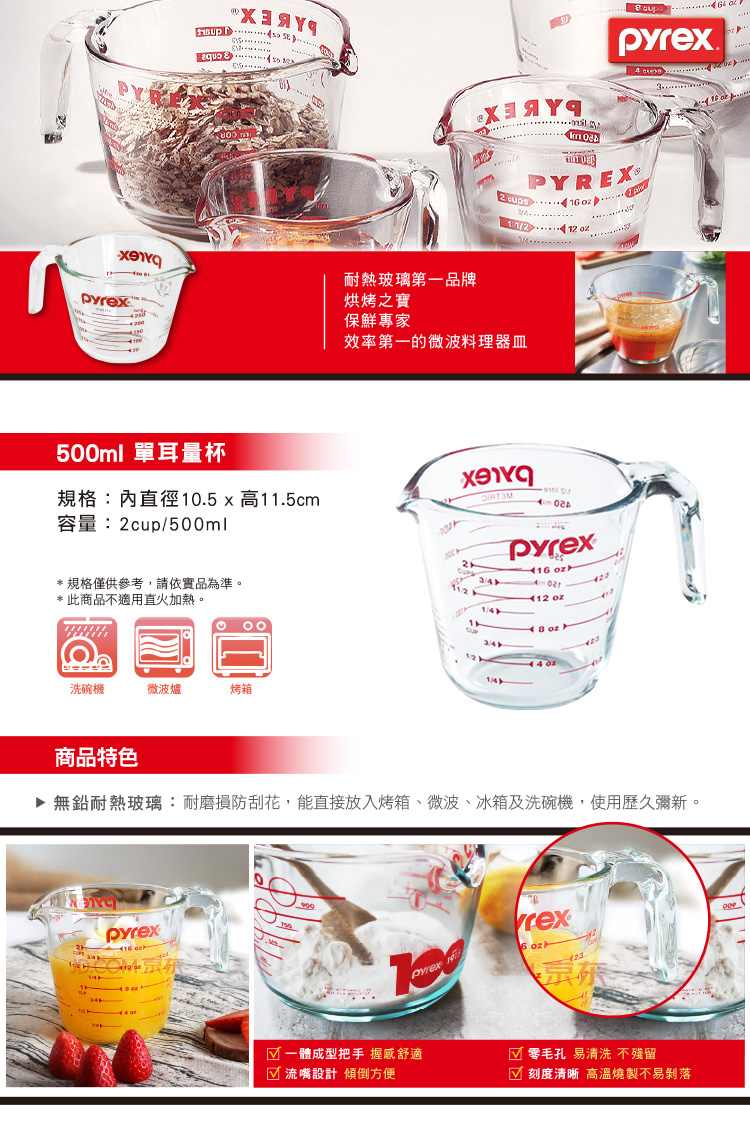 內含:【美國康寧 Pyrex】百麗單耳量杯500ml ,獨贈9吋透明餐盤一入