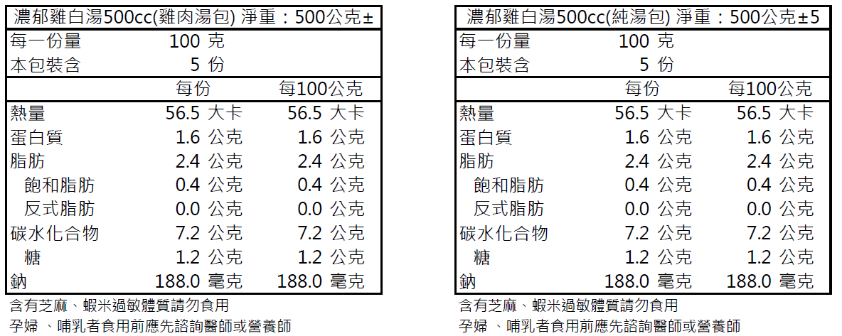 內容物成分: 水、玉米雞、雞爪、老母雞、豬後腿肉、干貝、金華火腿、胡椒粒、雞腿肉、枸杞、蟲草花、紅棗片、娃娃菜