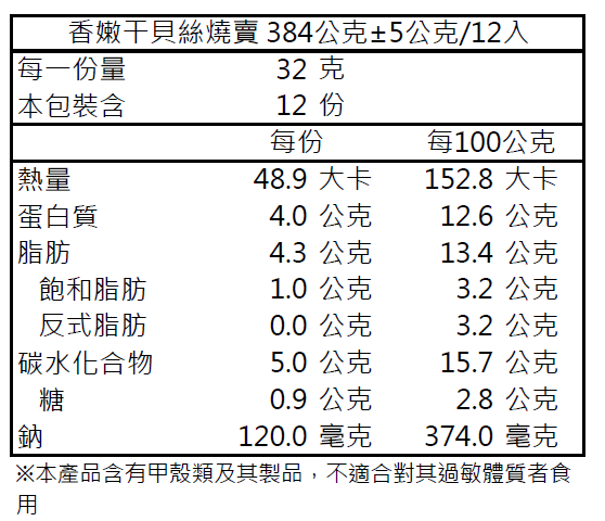 內容物成分: 豬肉(台灣)、豬背油脂(台灣)、草蝦仁、香菇、干貝絲、水、砂糖、太白粉、廼粉、食鹽、白胡椒粉、雞粉【鹽、麥芽糊精、L-麩酸鈉、糖、玉米澱粉、雞肉粉、香料、酵母萃取物(酵母萃取物、鹽)、雞油、棕櫚油、調味劑、5’-次黄嘌呤核苷磷酸二鈉、5’-鳥嘌呤核苷磷酸二鈉、白胡椒】