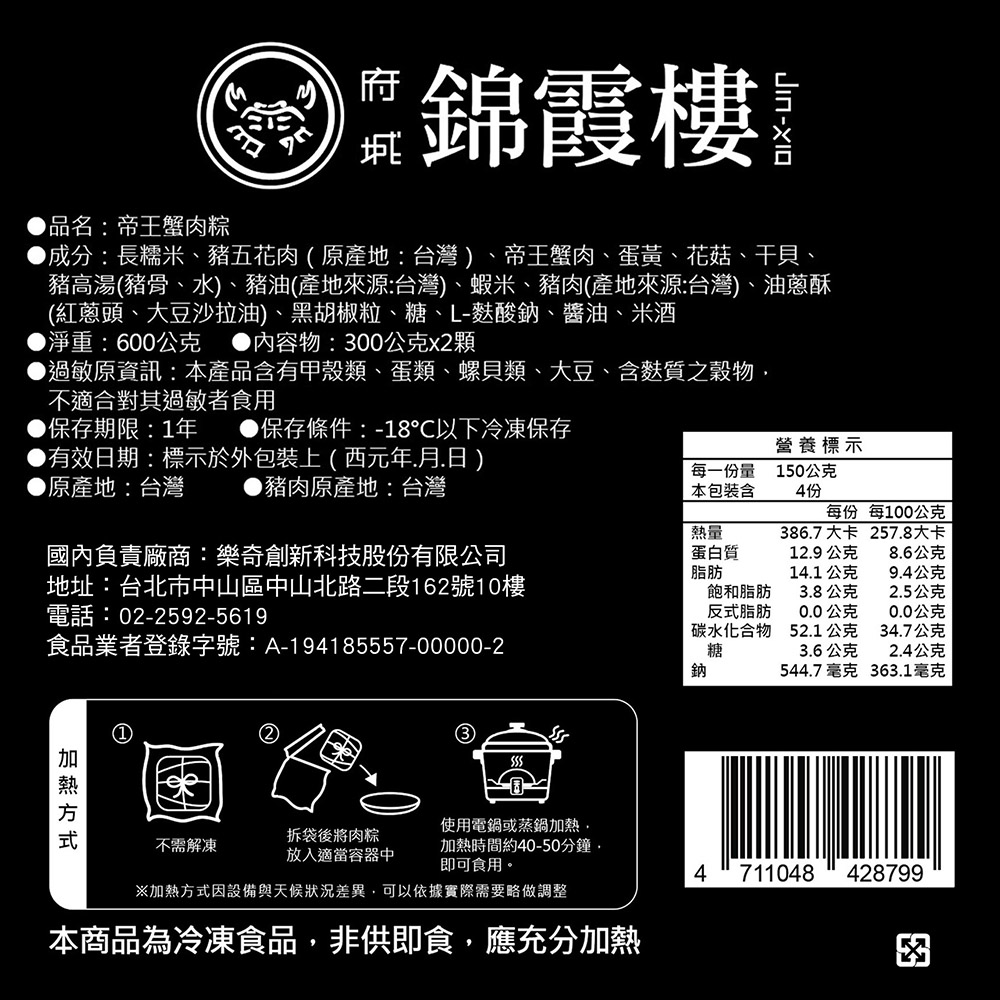 產品名稱: 【錦霞樓】帝王蟹肉粽禮盒(2入)