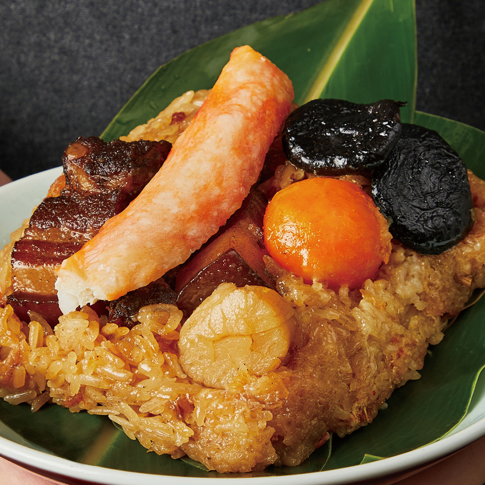 內容物成分: 長糯米、豬五花肉(原產地:台灣)、帝王蟹肉、蛋黃、花菇、干貝、豬高湯(豬骨、水)、豬油(產地來源:台灣)、蝦米、豬肉(產地來源:台灣)、油蔥酥(紅蔥頭、大豆沙拉油)、黑胡椒粒、糖、L-麩酸鈉、醬油、米酒。