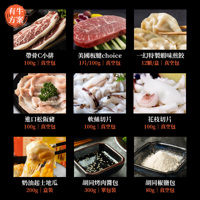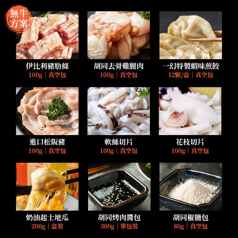 使用胡同燒肉店鋪相同等級,經手工修清去除多餘油脂與筋膜等部位的肉品,以經典人氣精選肉品集結,再搭配胡同精選海鮮,推出(有牛/無牛兩款)燒烤組合。貼心準備份量剛好的肉品,讓您可依家庭成員數來做選擇。本商品頁販售之組合為約可供1-2人食用的小資組合。