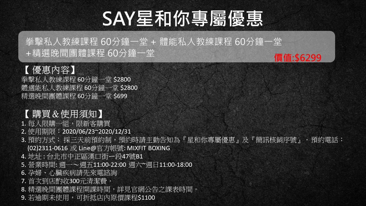 3.預約方式: 採三天前預約制,預約時請主動告知為『星和你專屬優惠』及『簡訊核銷序號』.預約電話:(02)2311-0616 或 Line@官方帳號: MIXFIT BOXING