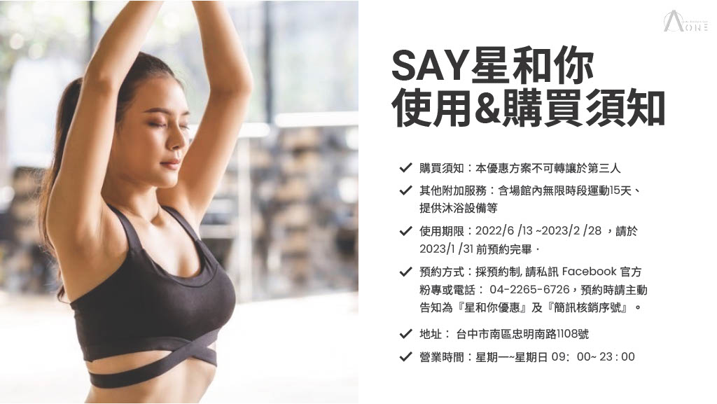 4.預約方式:採預約制,請私訊 Facebook 官方粉絲專頁『Aone boutique Gym』或 電話:04-2265-6726,預約時請主動告知為『星和你優惠』及『簡訊核銷序號』。