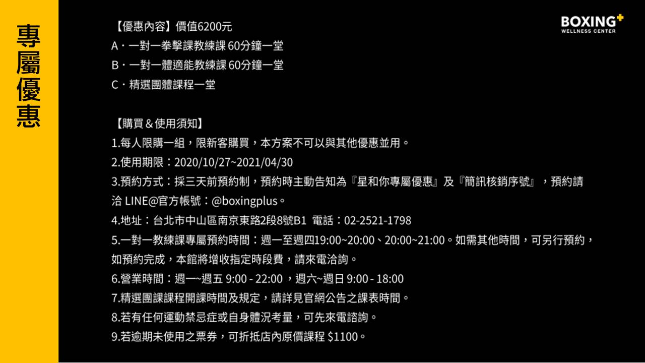 3.預約方式:採三天前預約制,預約時主動告知為『星和你專屬優惠』及『簡訊核銷序號』,預約請洽 LINE@官方帳號:@boxingplus