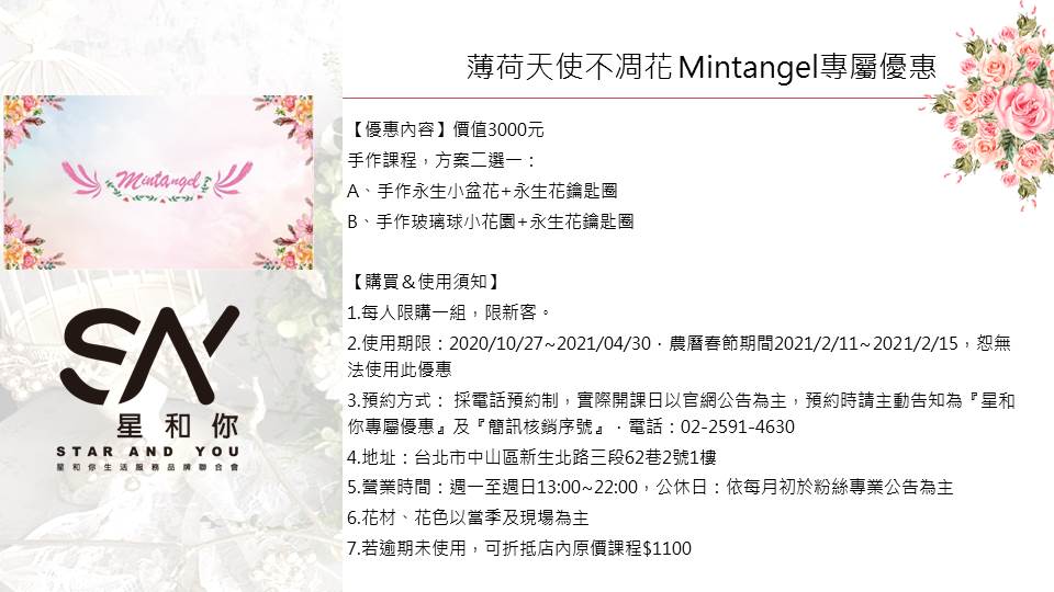 2.使用期限:2020/10/27~2021/04/30.農曆春節期間2021/2/11~2021/2/15,恕無法使用此優惠