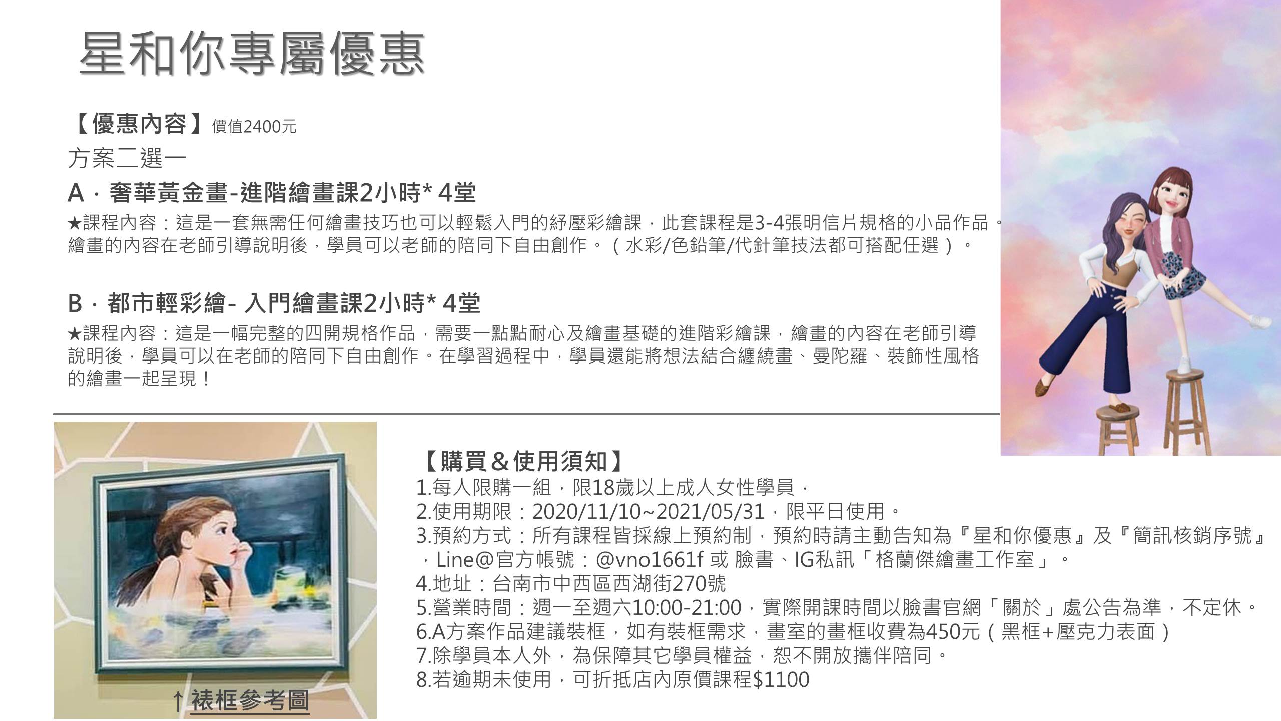 3.預約方式:所有課程皆採線上預約制,預約時請主動告知為『星和你優惠』及『簡訊核銷 序號』,Line@官方帳號:@vno1661f 或 臉書、IG搜尋並私訊「格蘭傑繪畫工作室」。