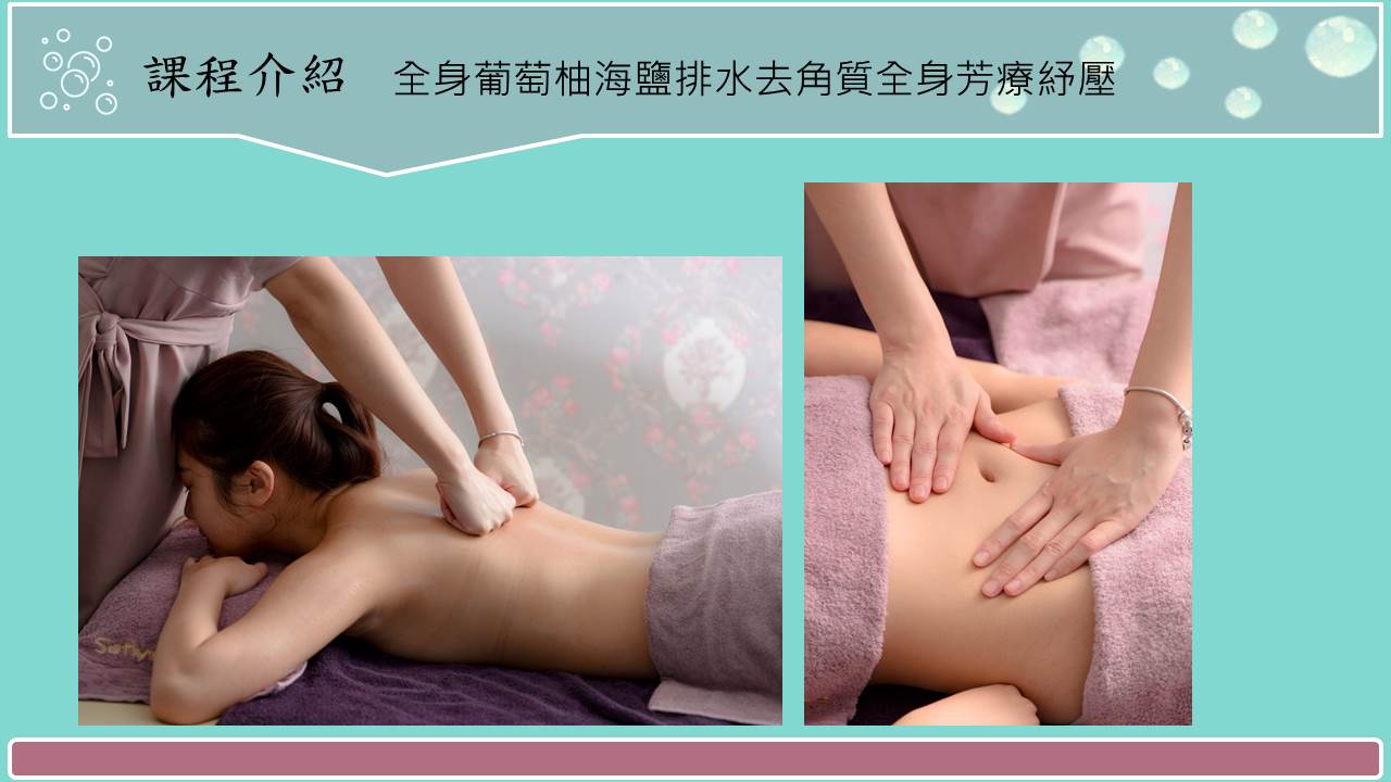 全身葡萄柚海鹽排水去角質全身芳療紓壓50分鐘→地中海美背敷泥20分鐘→臉部撥筋舒活頭部刮療按摩30分鐘,共100分鐘一堂