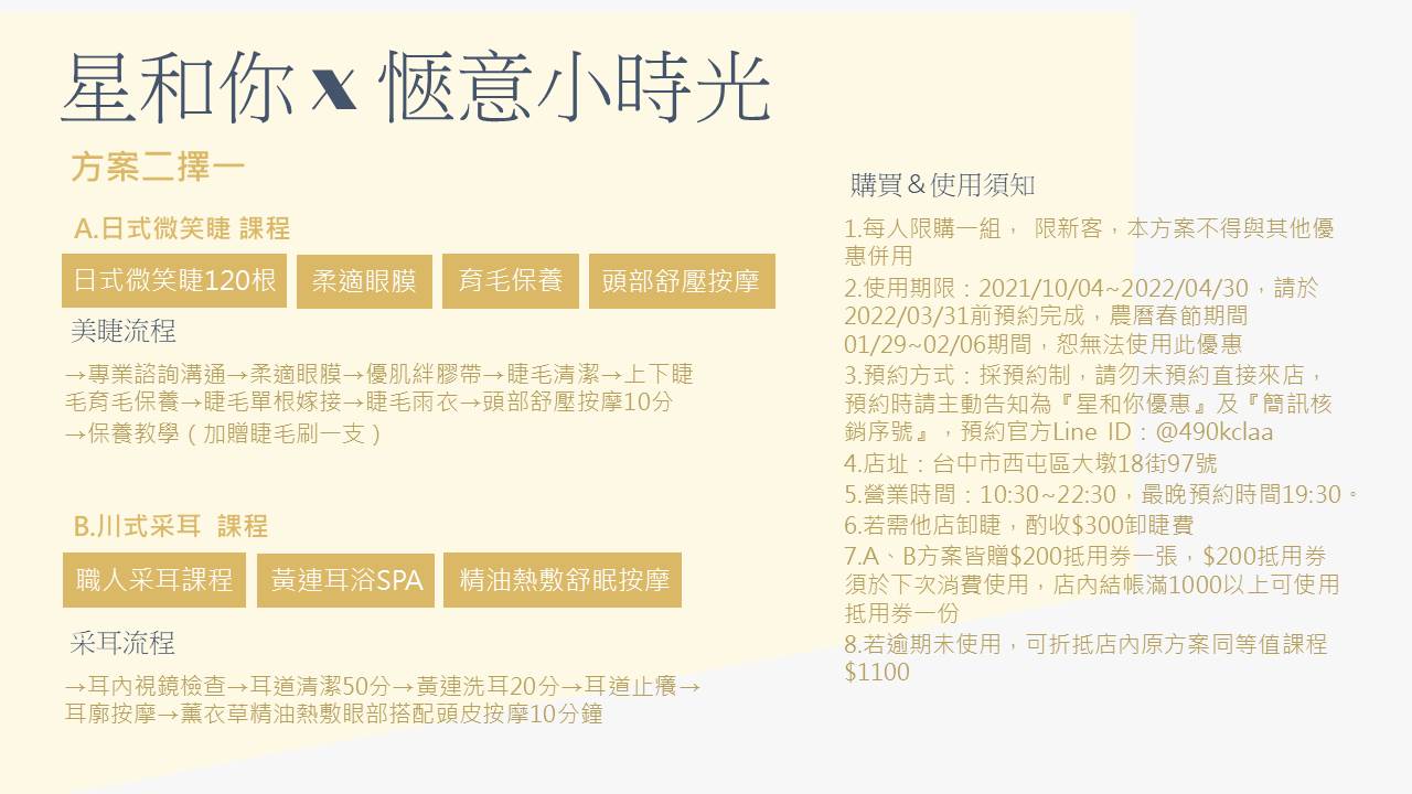 3.預約方式:採預約制,請勿未預約直接來店,預約時請主動告知為『星和你優惠』及『簡訊核銷序號』,預約官方Line ID:@490kclaa