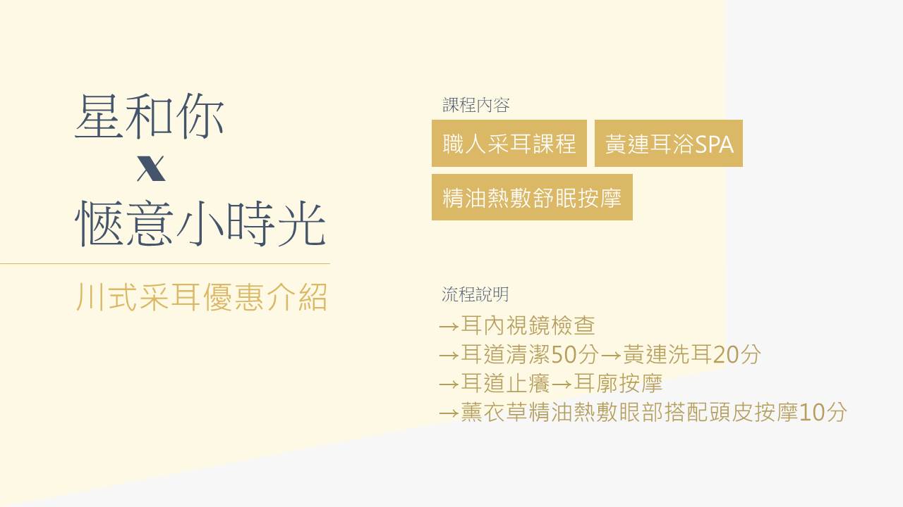 ★采耳流程:耳內視鏡檢查→耳道清潔50分→黃連洗耳20分→耳道止癢→耳廓按摩→薰衣草精油熱敷眼部搭配頭皮按摩10分鐘