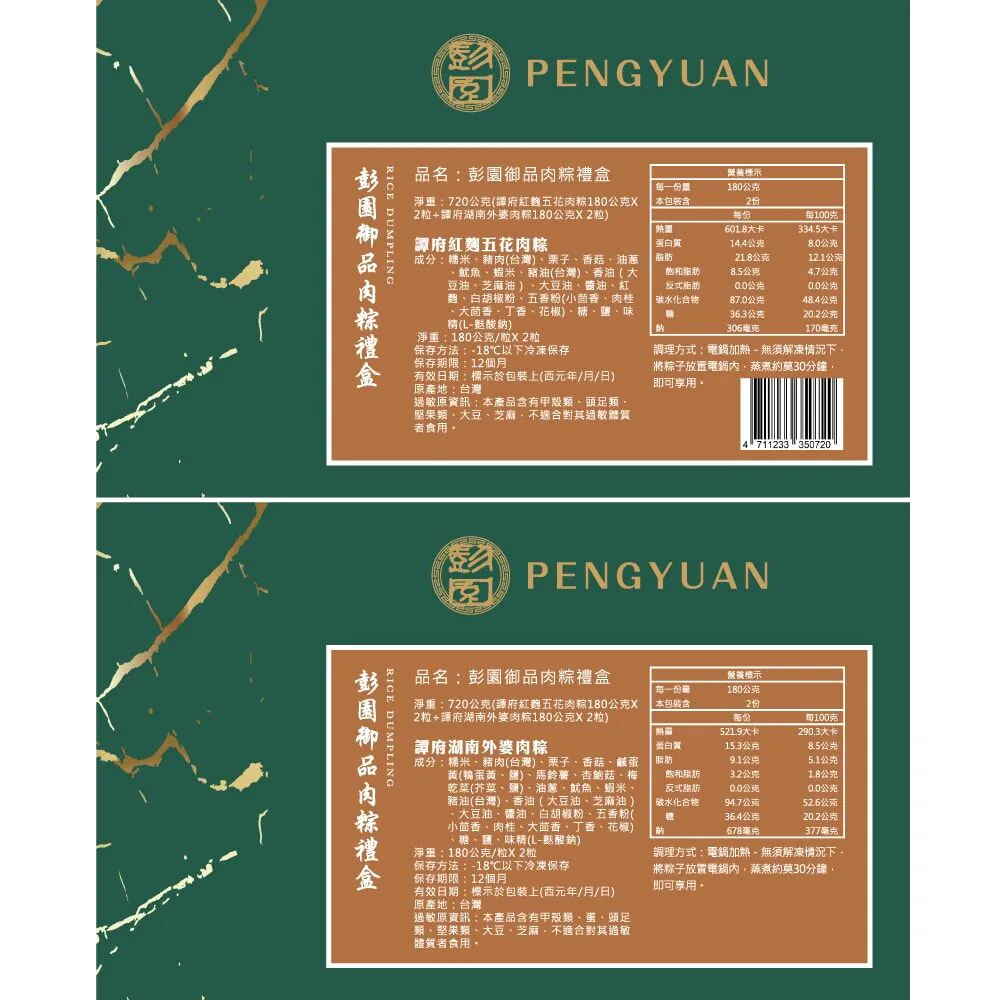 內含:720公克(譚府紅麴五花肉粽180公克X2粒+譚府湖南外婆肉粽180公克X2粒)