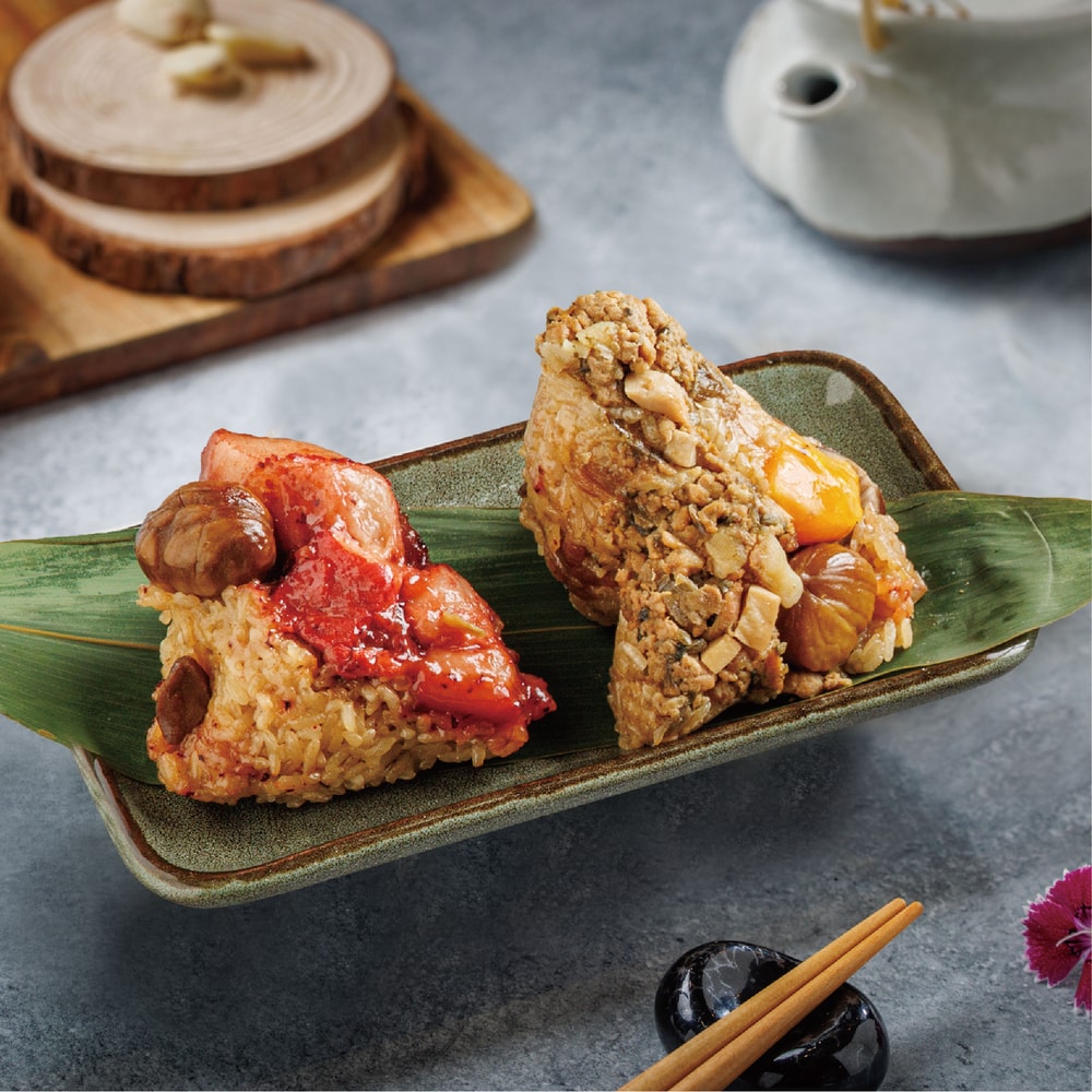 譚府紅麴五花肉粽:精選肥瘦適中的五花肉,紅糟揉製入味,搭配飽滿栗子,佐以香菇、魷魚、蝦米美味提鮮,一口咬下綻放在嘴裡的絕妙滋味實在是讓人欲罷不能。