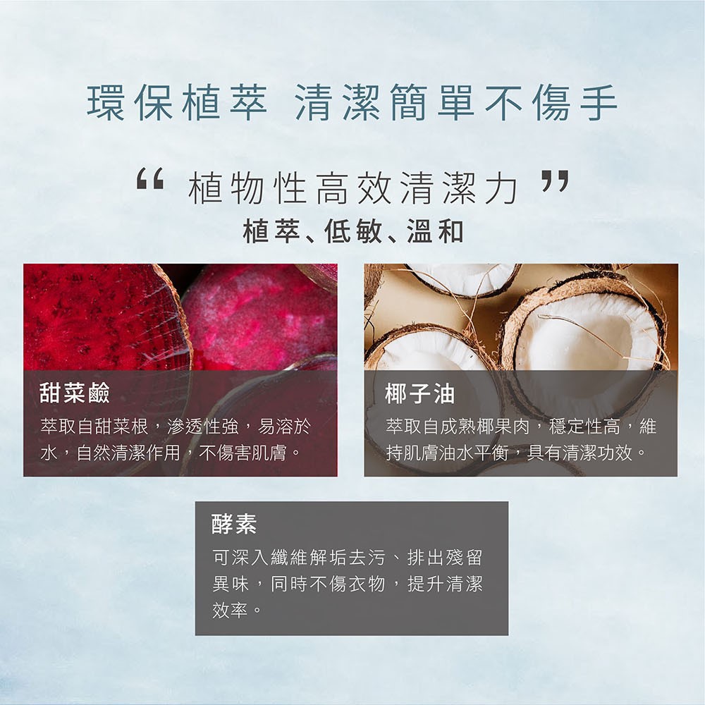 0%石化成分,洗淨無殘留最安心。
