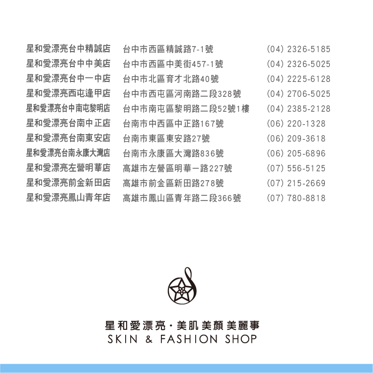2. 適用店別:美容課程及保養品憑簡訊序號至全台星和愛漂亮美顏館兌換