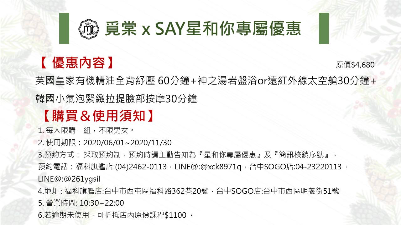 3. 預約方式: 採電話預約,預約時請主動告知為『星和你專屬優惠』及『簡訊核銷序號』.
