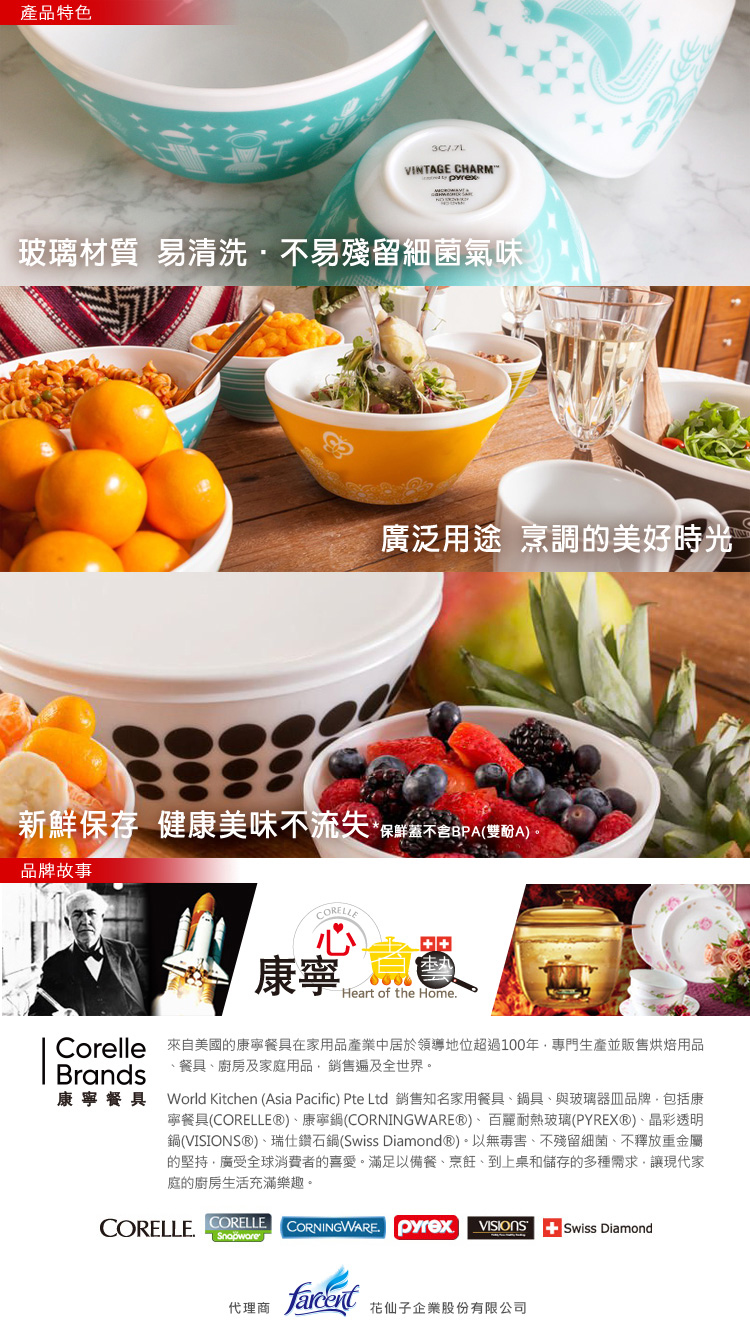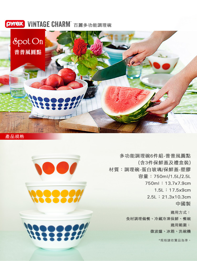 內含:【美國康寧 Pyrex】百麗 Vintage多功能調理碗6件禮盒組(普普風)