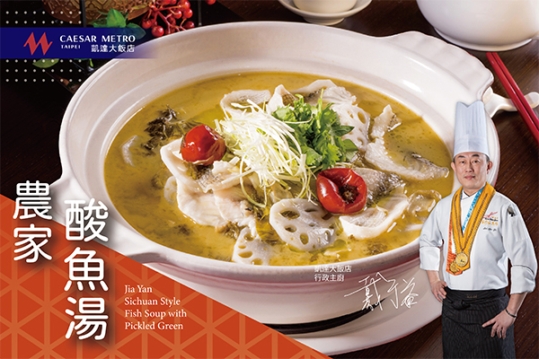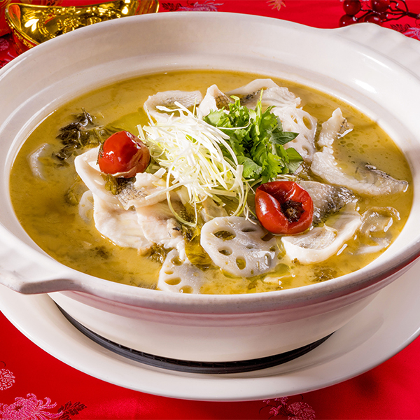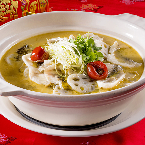 獲得2020年亞太年度十大名菜、選用關西北埔一帶客家醃製酸菜,有著甘甜濃郁發酵後的鹹香味,再搭配新鮮魚片,將客家酸菜、泡薑、泡椒下鍋炒出酸香,接著放入魚骨以及熬煮8小時的高湯,讓魚肉綿密吸收淡雅酸香,一入口鮮味立即湧上舌尖,酸中微辣又帶點清甜,刺激食客的味蕾。