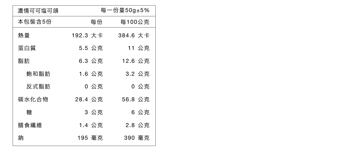 麵粉、水、非基改豆渣、奶油、鮮奶、赤藻醣醇、可可粉(可可豆)、鹽、巧克力豆、酵母