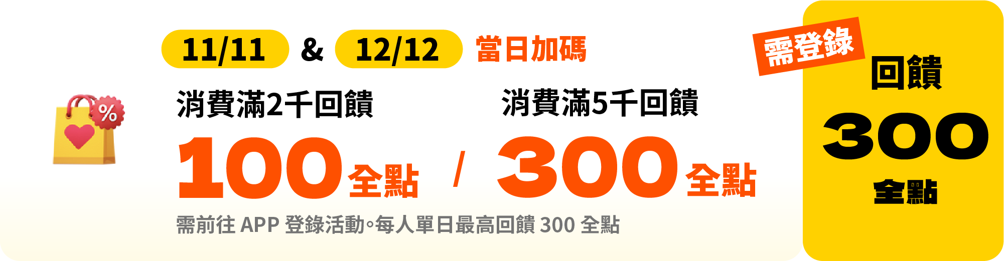 ▍雙11、雙12單筆消費滿額享最高300全點回饋
