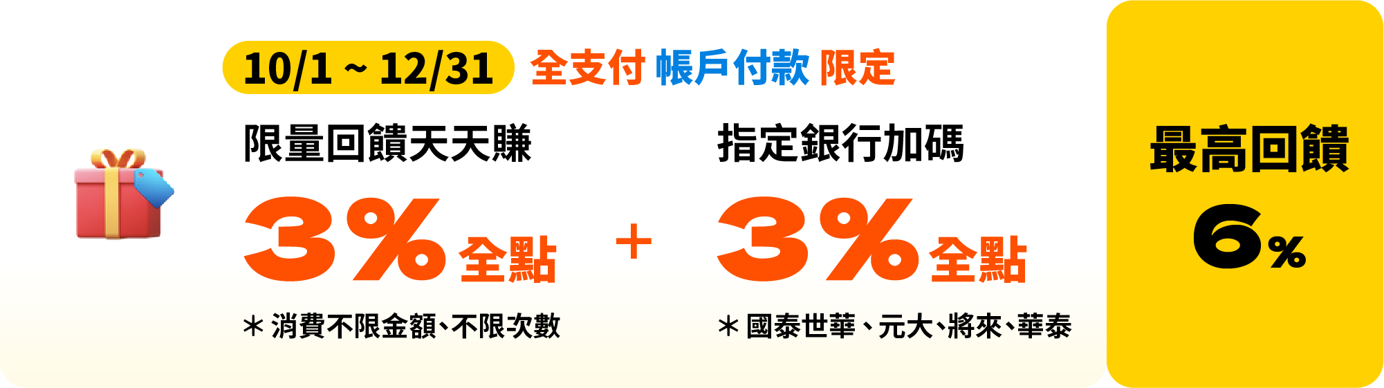 活動內容:帳戶付款3%無腦刷,限量回饋天天賺|連結指定合作銀行帳戶加碼3%全點回饋,最高享6%全點回饋!