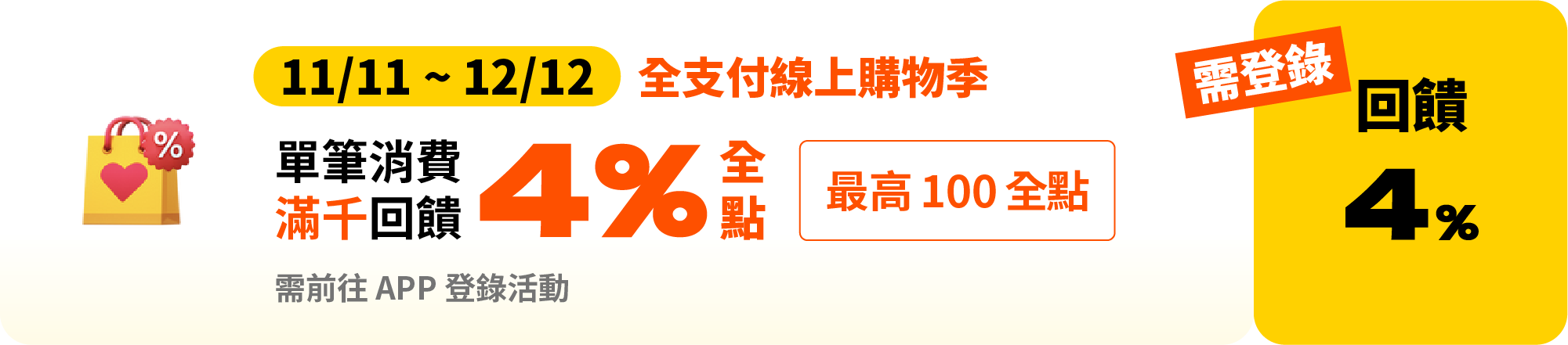 活動內容:本活動於2025/11/5 (四) 00:00起開放登錄,完成活動登錄後,於活動時間內使用全支付進行付款,單筆消費滿$1,000(含),即可享4%全點回饋。