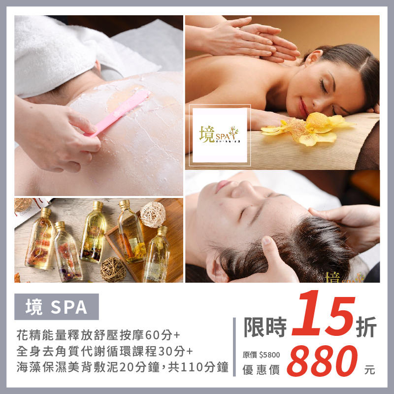 SAY星和你 高雄 | 境 SPA | 花精能量釋放舒壓按摩60分+全身去角質代謝循環課程30分+海藻保濕美背敷泥20分鐘,共110分鐘