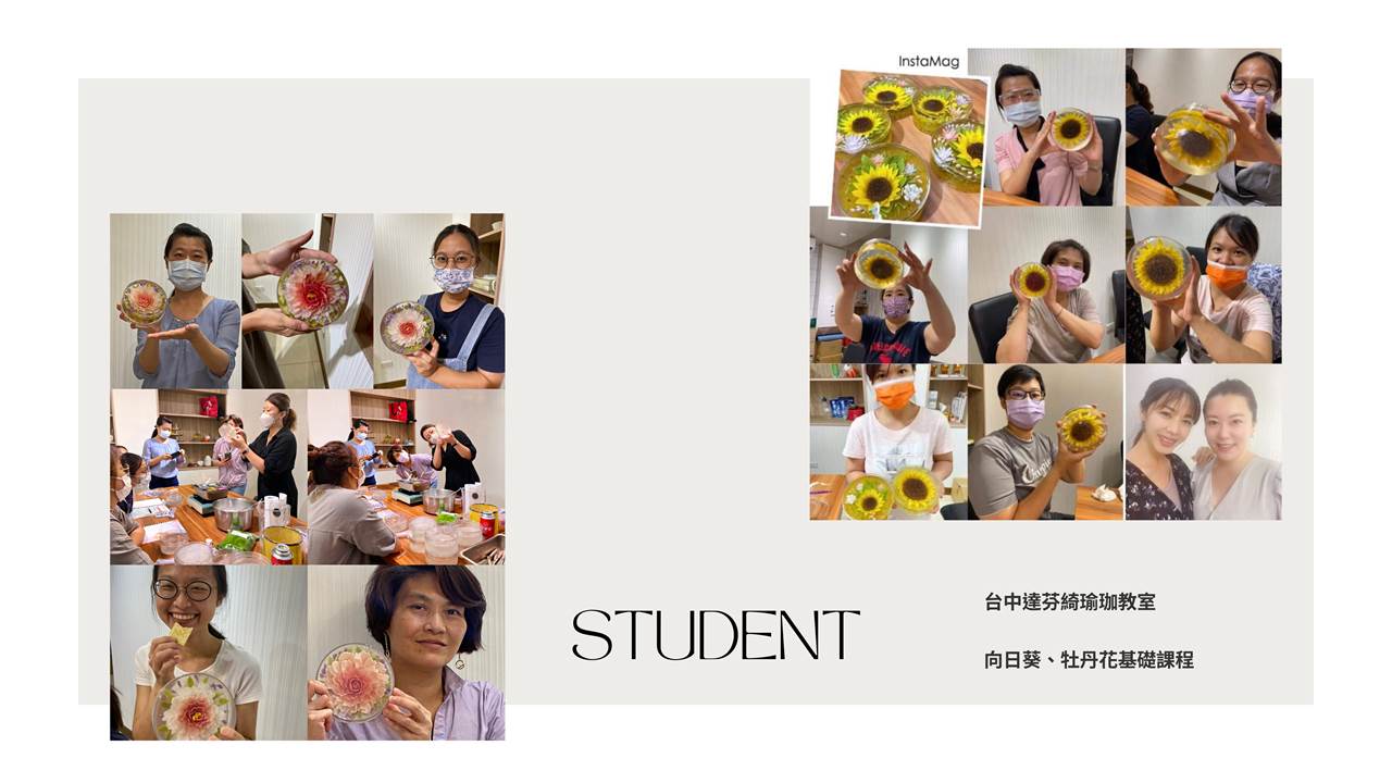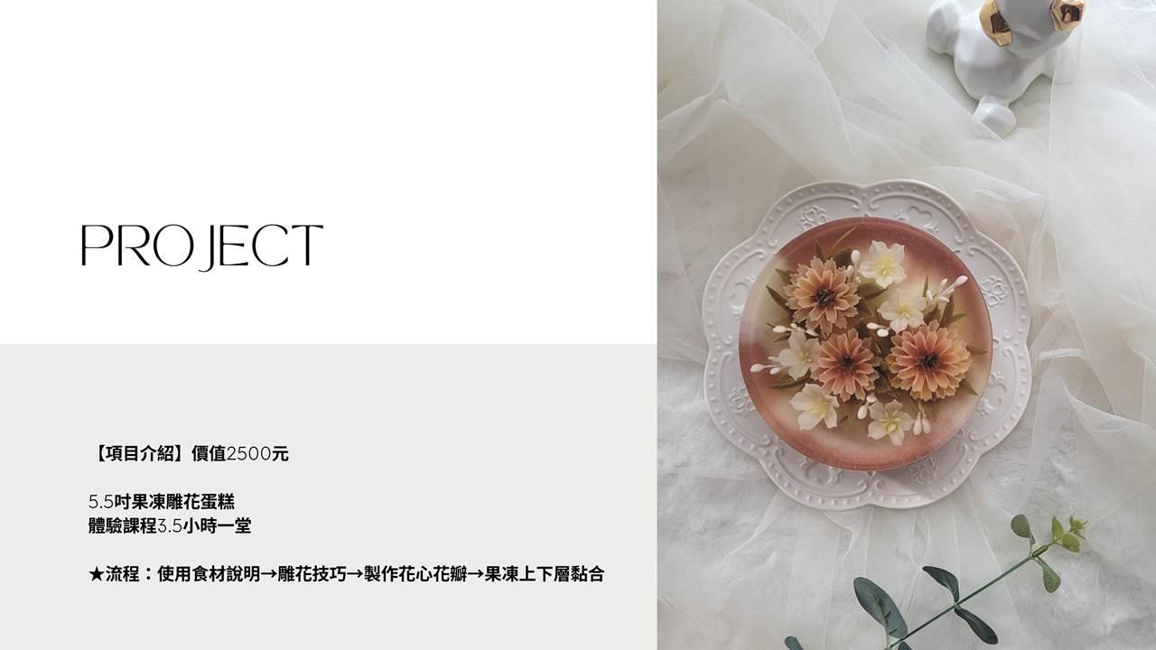 6.上課提供雕花使用工具,課後需歸還教室,體驗課使用的果凍、食材及包裝由教室準備,課程中製作之花型,以現場自選工具為主