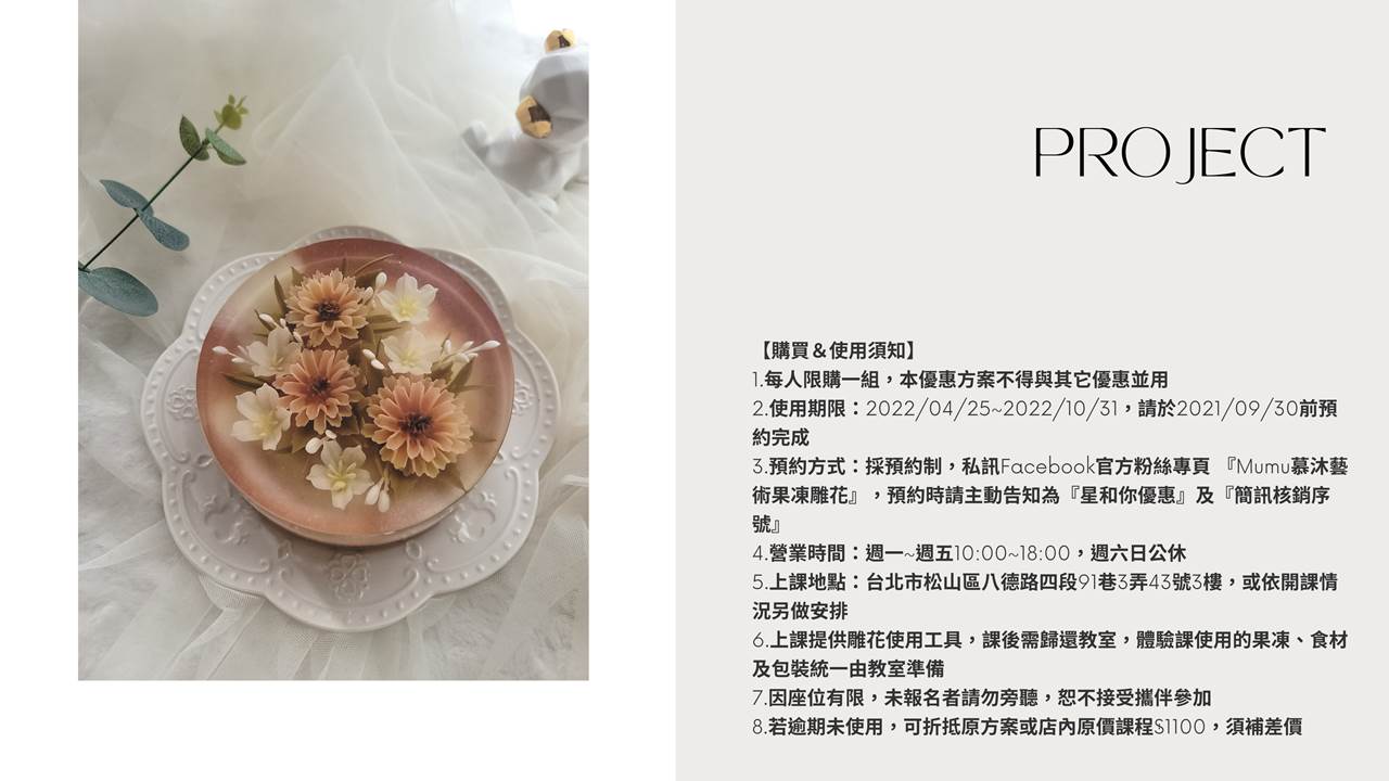 3.預約方式:採預約制,私訊Facebook官方粉絲專頁 『Mumu慕沐藝術果凍雕花』,預約時請主動告知為『星和你優惠』及『簡訊核銷序號』