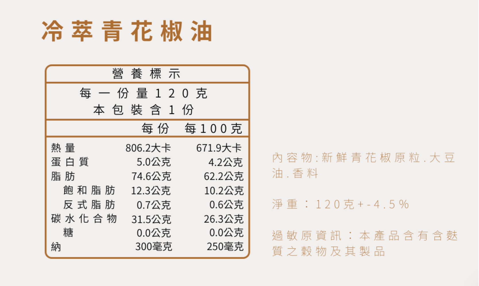 內容物:新鮮青花椒原粒、大豆油、香料
