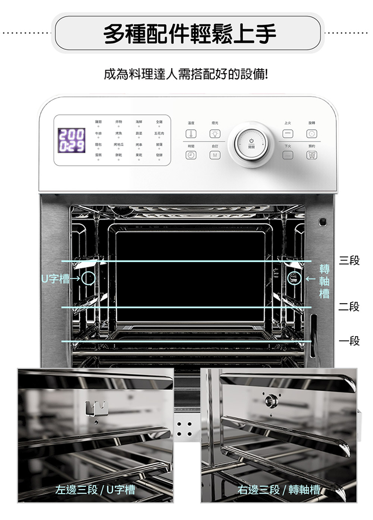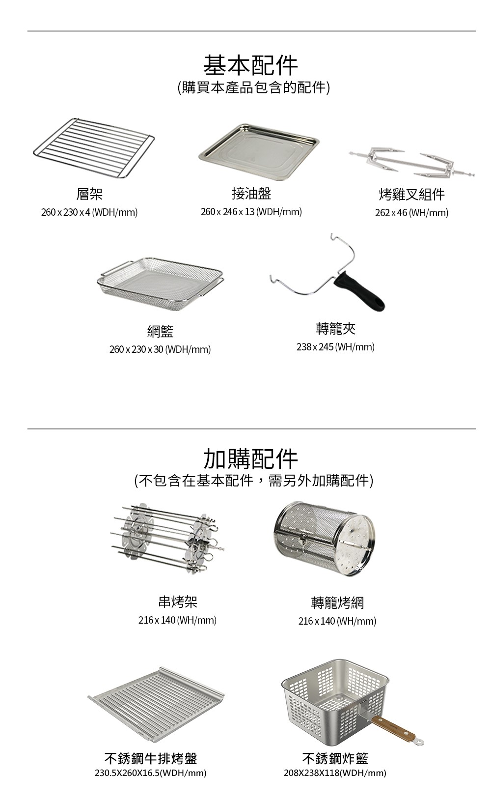 5件組配件:層架、瀝油盤、轉軸+烤雞固定架、轉籠夾、細網籃、串烤架、轉籠